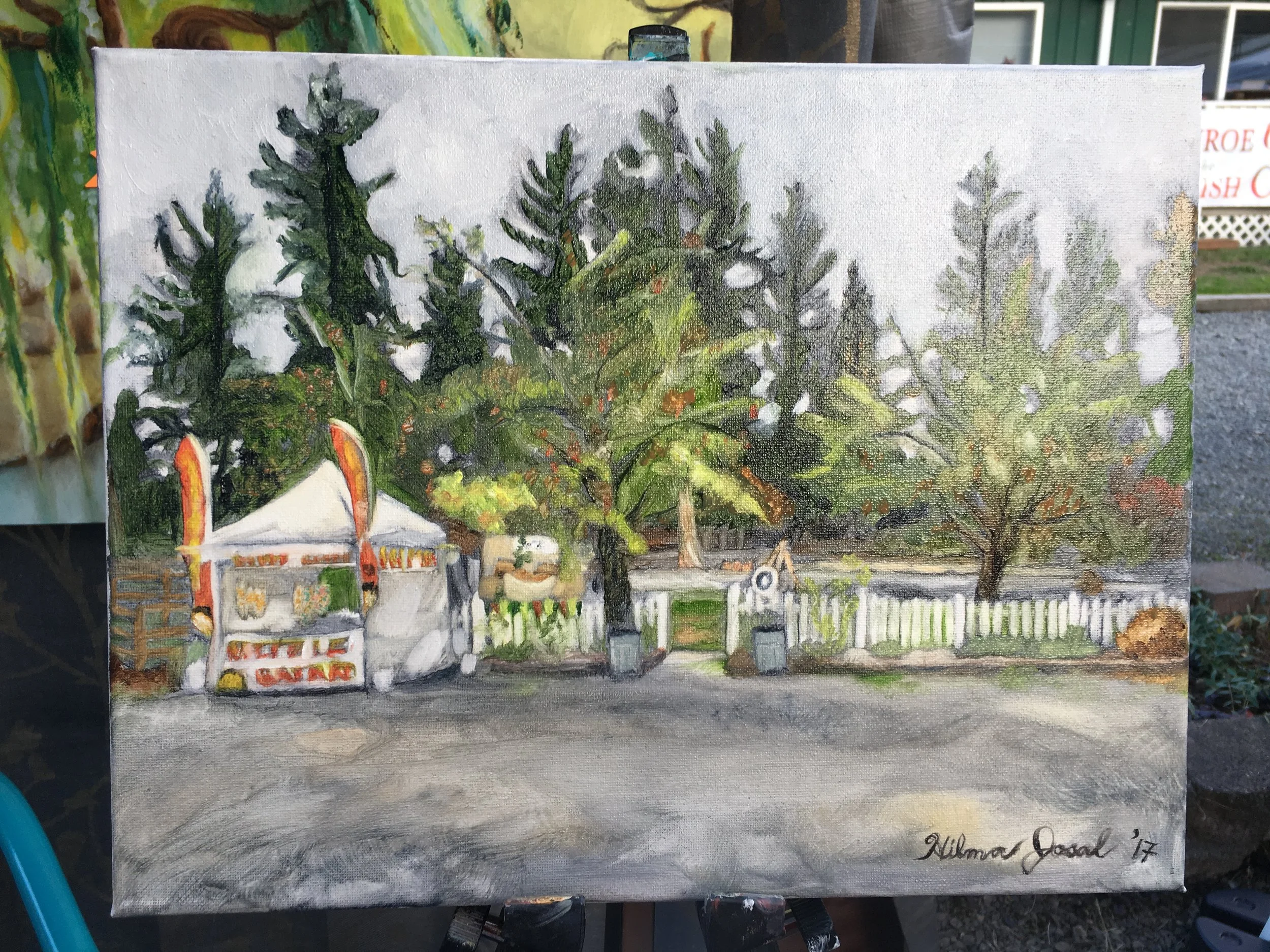 This is my Plein Air oil painting of the landscape including the Kettle Corn tent beside me. My former student, Sam, was a mounted archer in that outdoor arena pictured here. I took a pic to add people later if that's up anyone's alley.