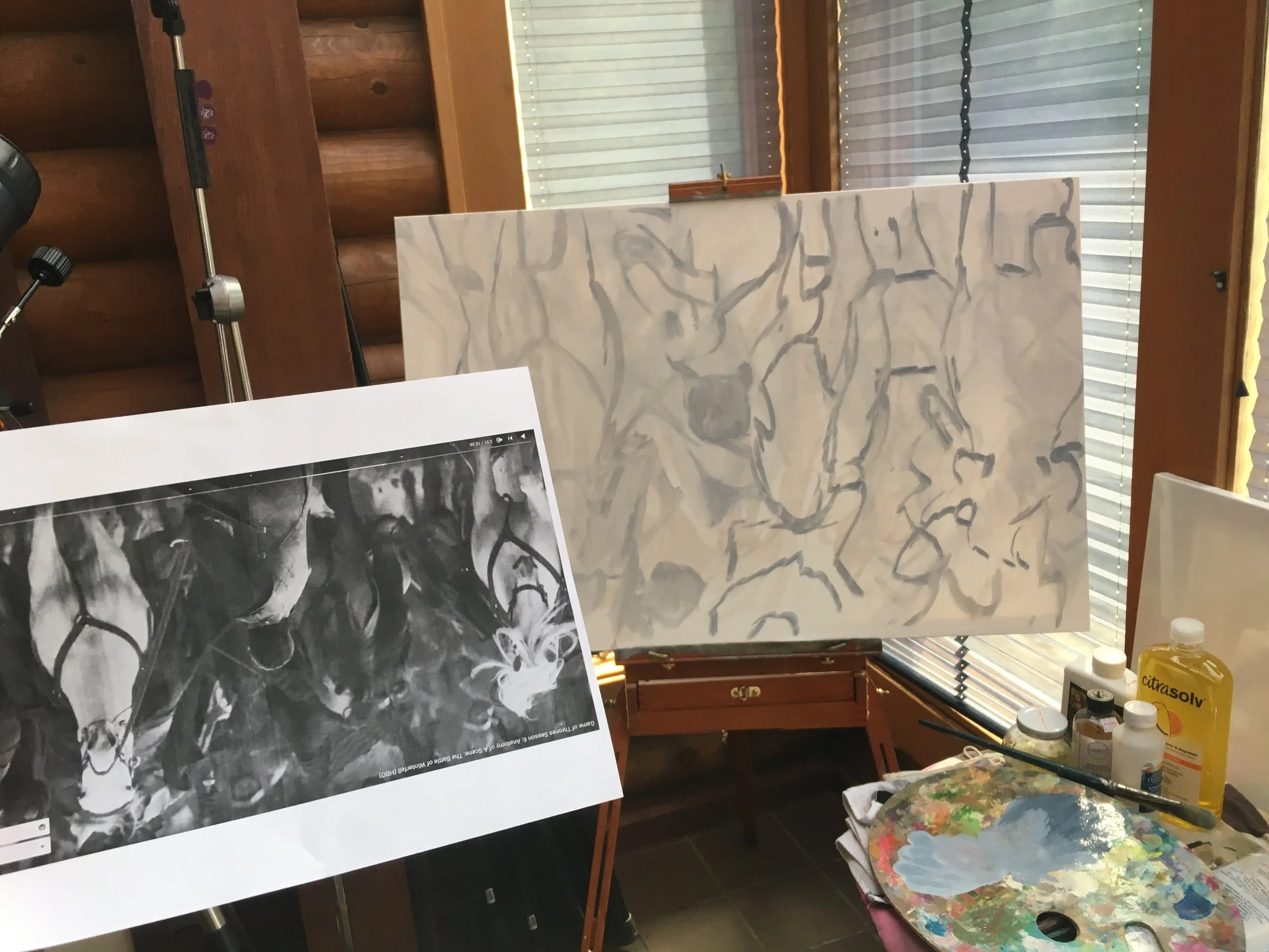 Now begins my year of painting Game of Thrones horse art. Here is my first drawing in progress. I chose this picture because it gives me the feels and being brave is my favorite quality in personalities -like when someone sings or when someone does something kind. I'm using a picture I printed in black and white.