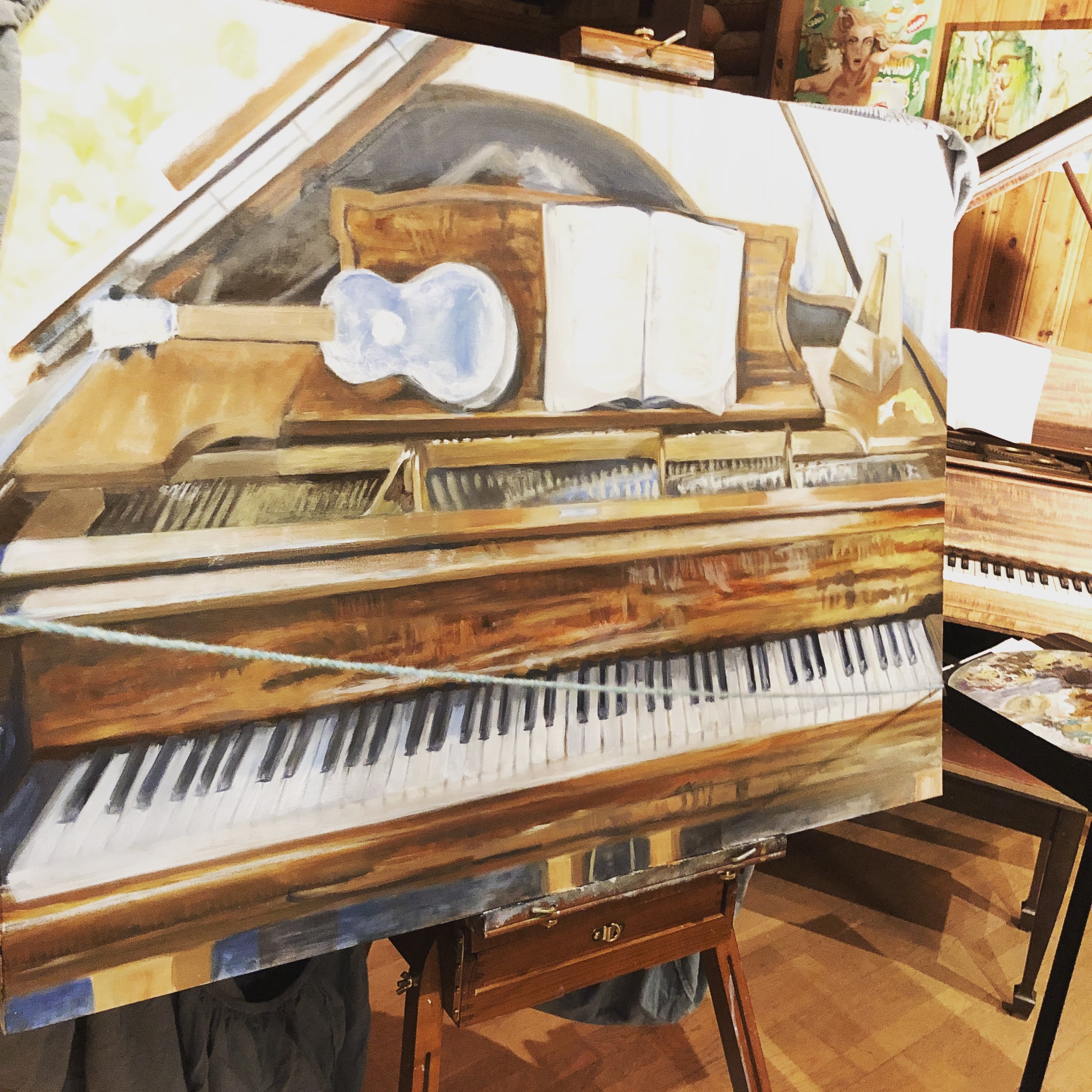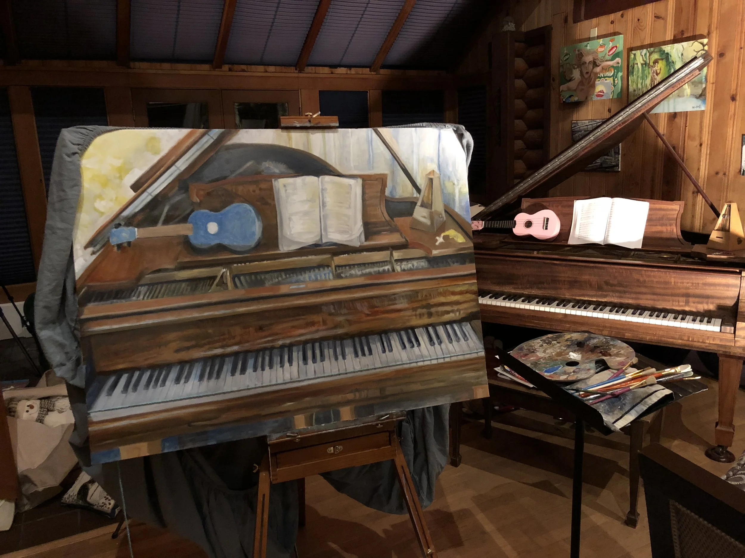 After working all day fixing all parts: legs, keys (still not close yet), shadows galore and then redoing shadows, the book, the uke, the metronome, the body, and the lid.
