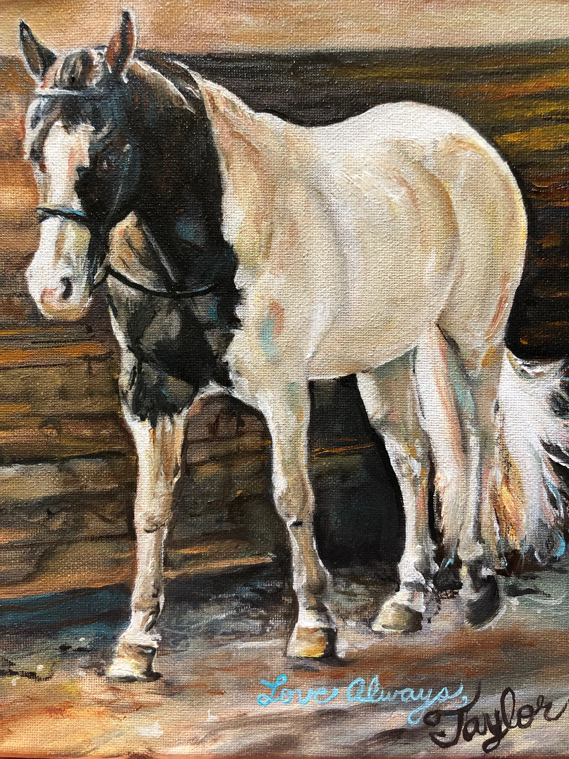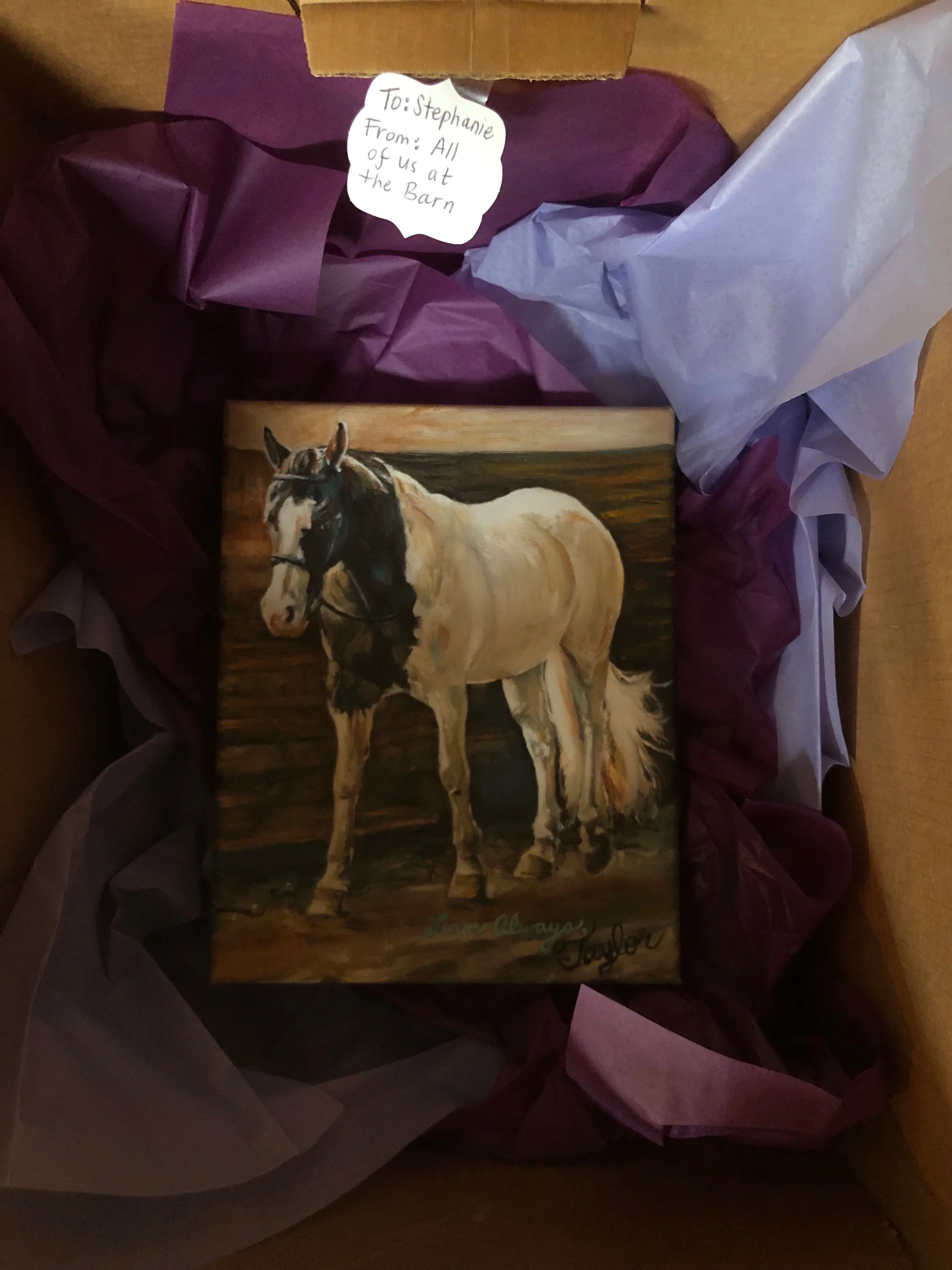 This is Day 1 of Taylor. I’m collaborating with my Gate’s Equestrian Barn Family to make a special tribute for Stephanie. The picture is by CRM Photography. Sharon named the piece, “Love Always, Taylor.” Dani recommended Jasmine and Rose as the oils I mix with the paint because they are connected with Angels and love. I might get a frame and will get others’ input so that the gift is from everyone.